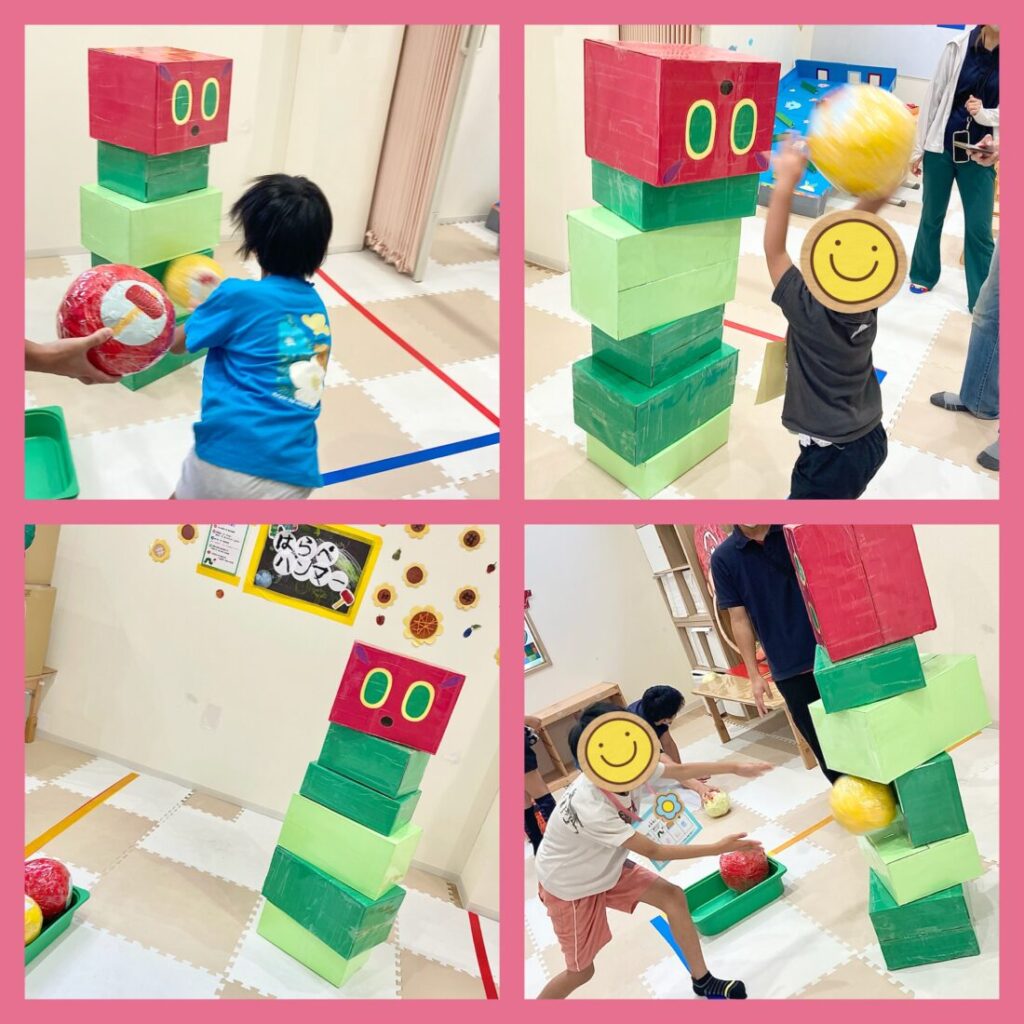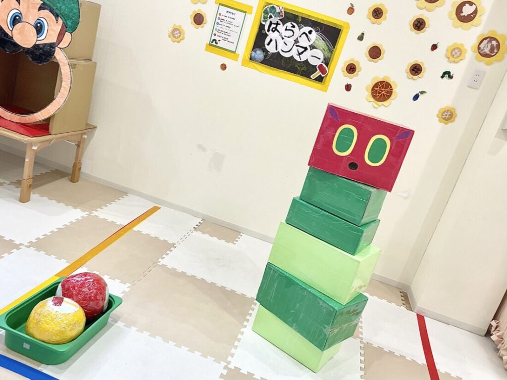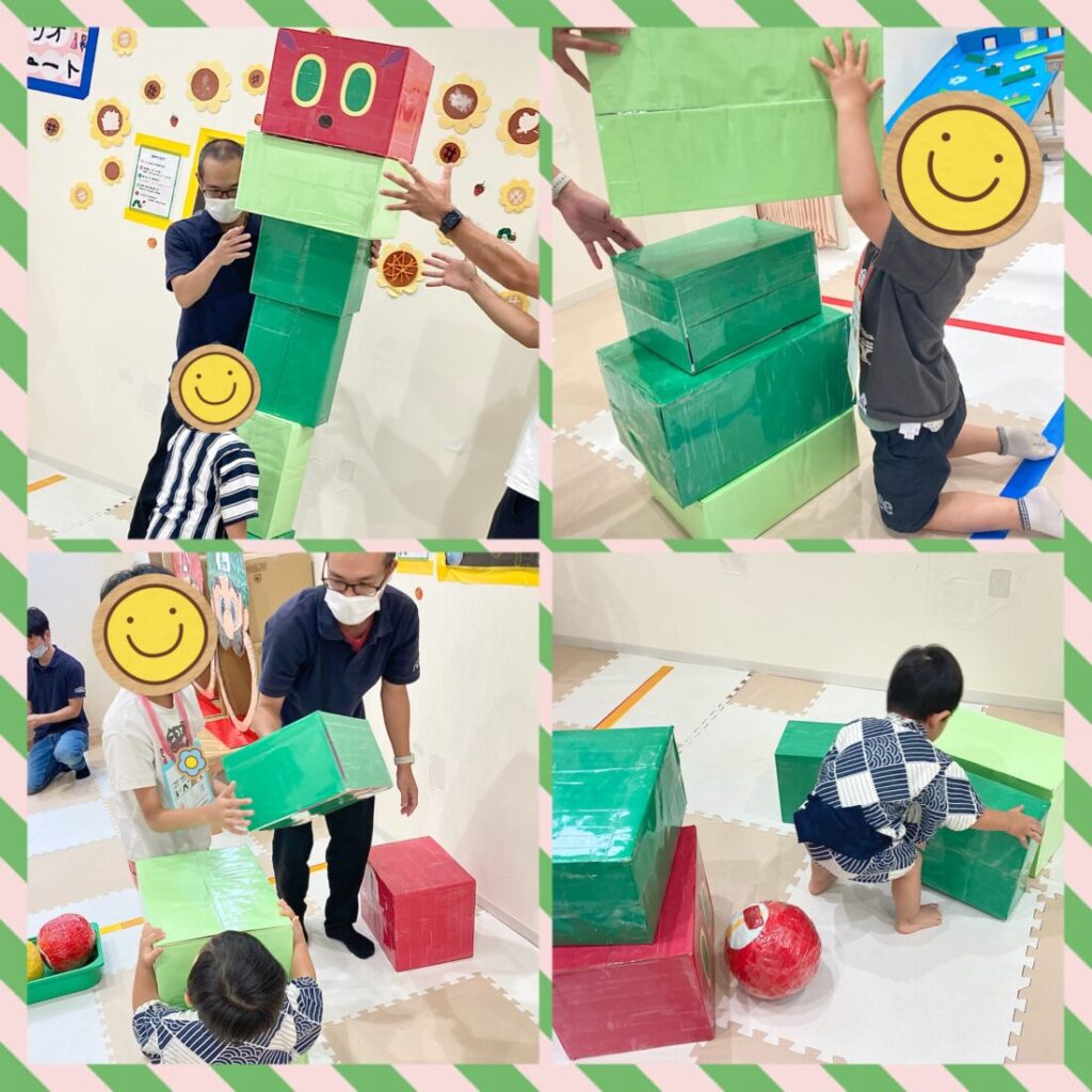 ご家族やお友だち・スタッフと協力して、あおむしを組み立て、