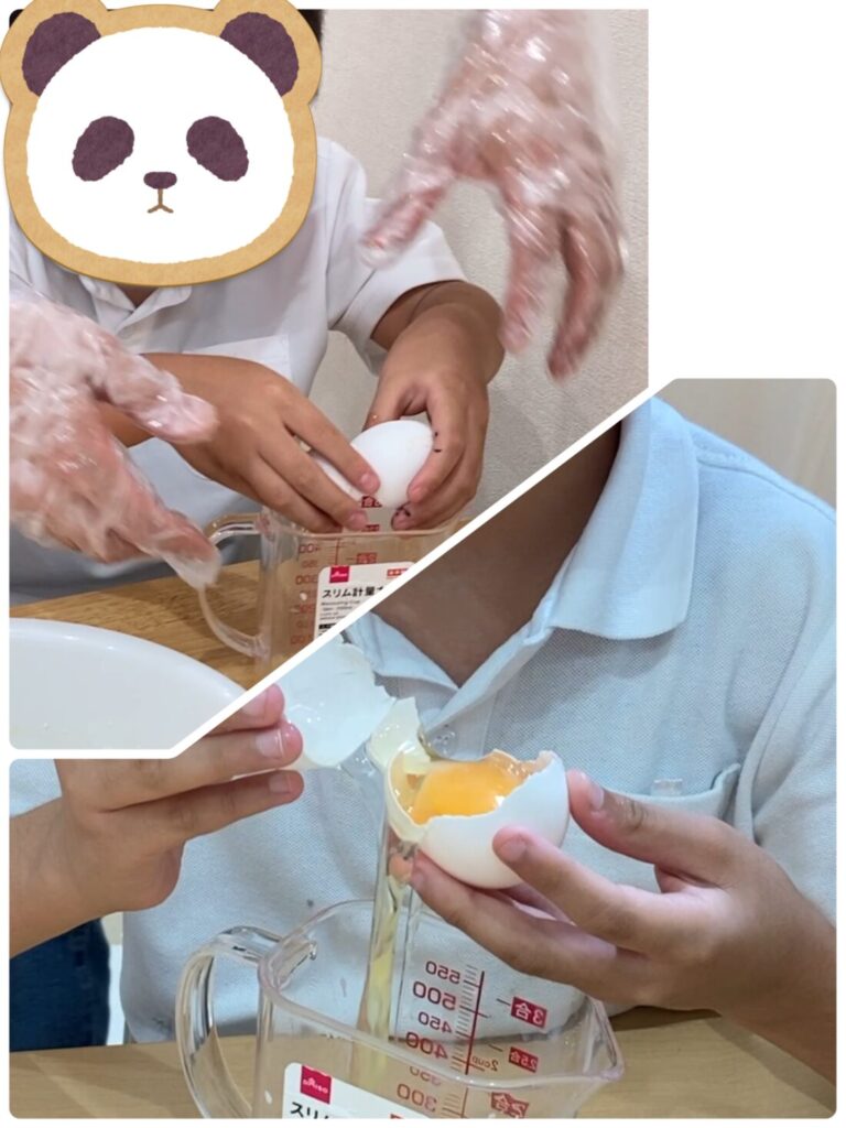 今回、卵を割るのは2人のお友達に挑戦してもらいました。2人とも少しの力加減でちょっとずつ割れ目を入れて、殻も慎重に開いて、殻を混入することなくできました👍お見事👍