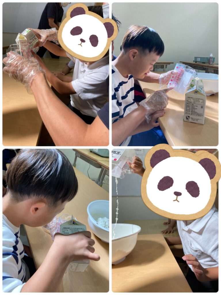 牛乳を計量カップで測りボールに投入します🫗。こぼさないように慎重に入れてくれてます。がんばれ~😊