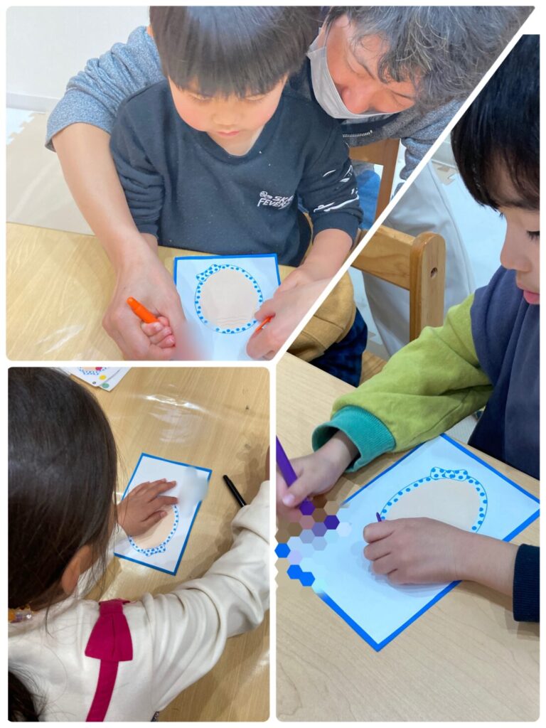 一文字ずつ自分の名前を書いたり、色を変えたりしながら、「きれいに書けた!」と、集中して取り組む姿が見られました。👍